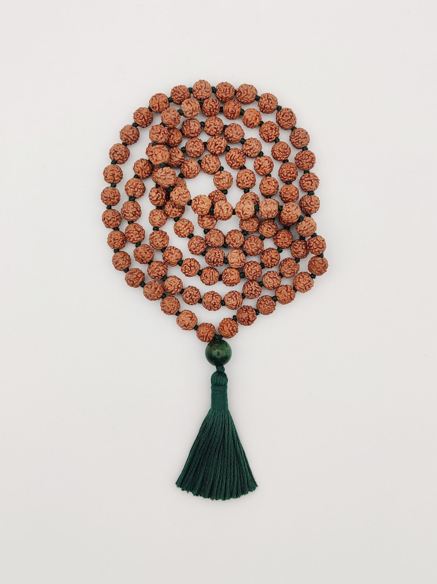 Eine klassische rudrākṣa–mālā mit Guru-Perle aus Smaragd, smaragdgrünem Faden und Quaste. Die aus Indien stammenden Samen sind ungefärbt und unbehandelt.