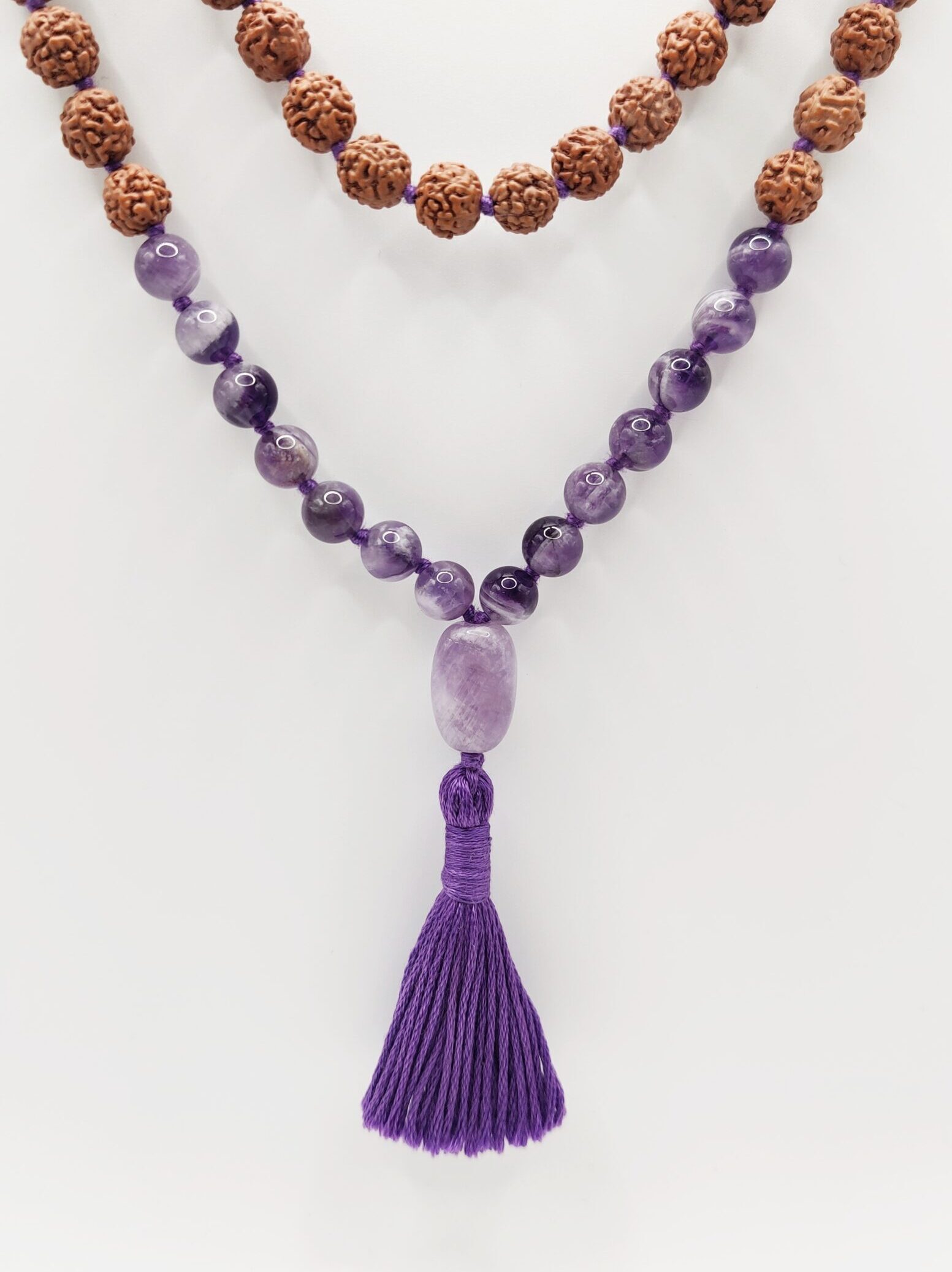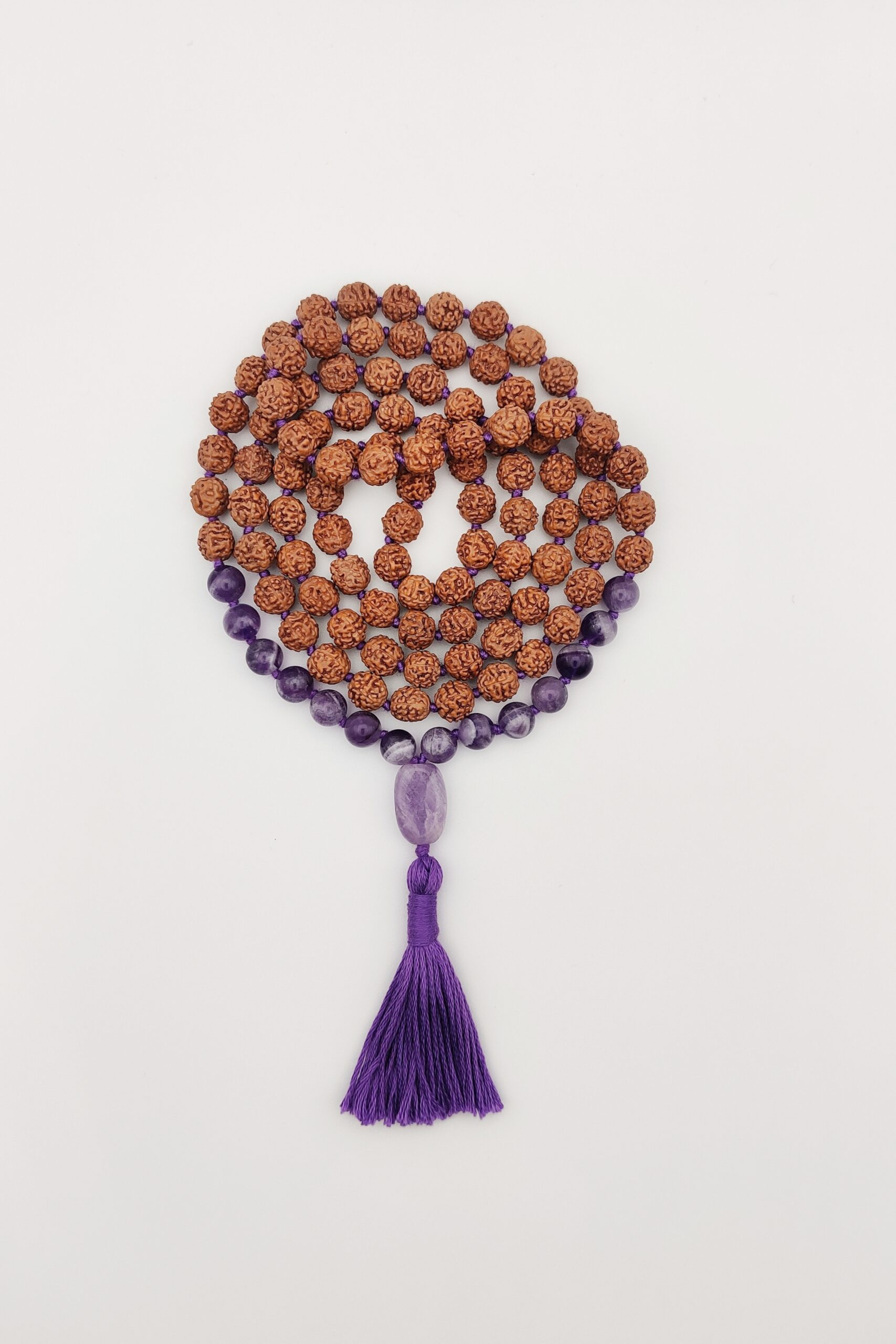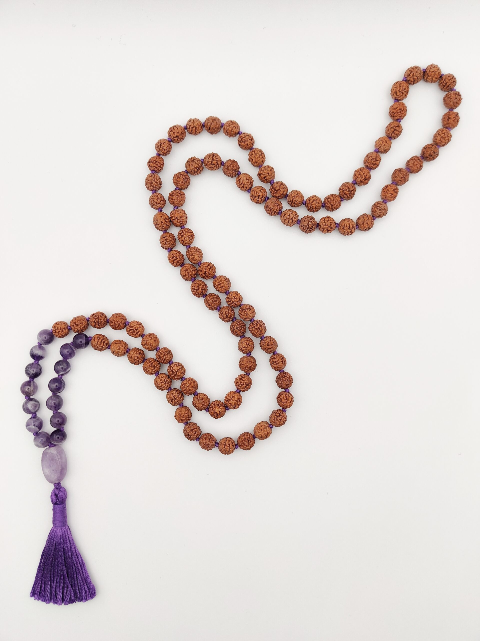 Eine rudrākṣa-mālā mit Amethyst veredelt für die, die es gerne außergewöhnlich mögen.