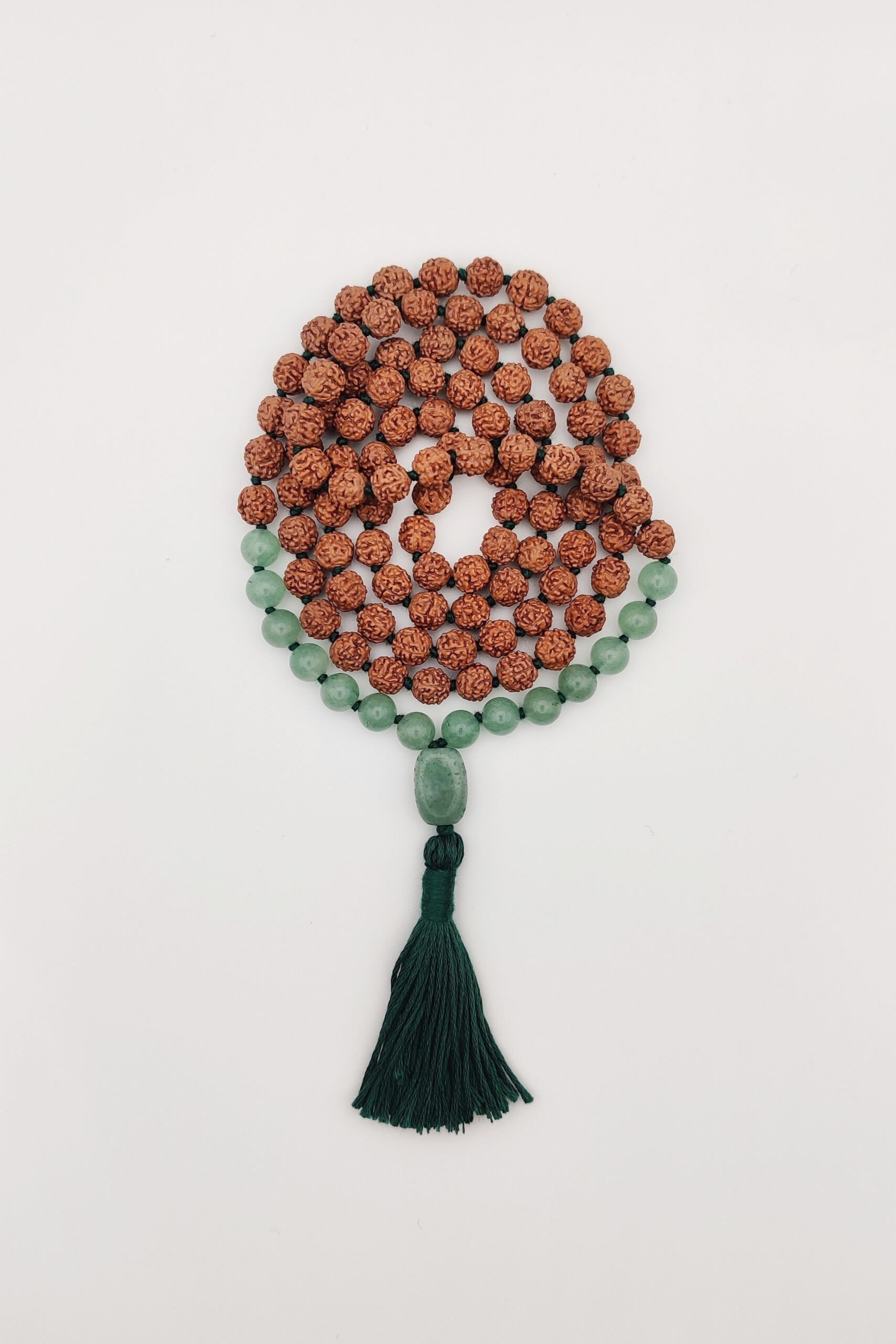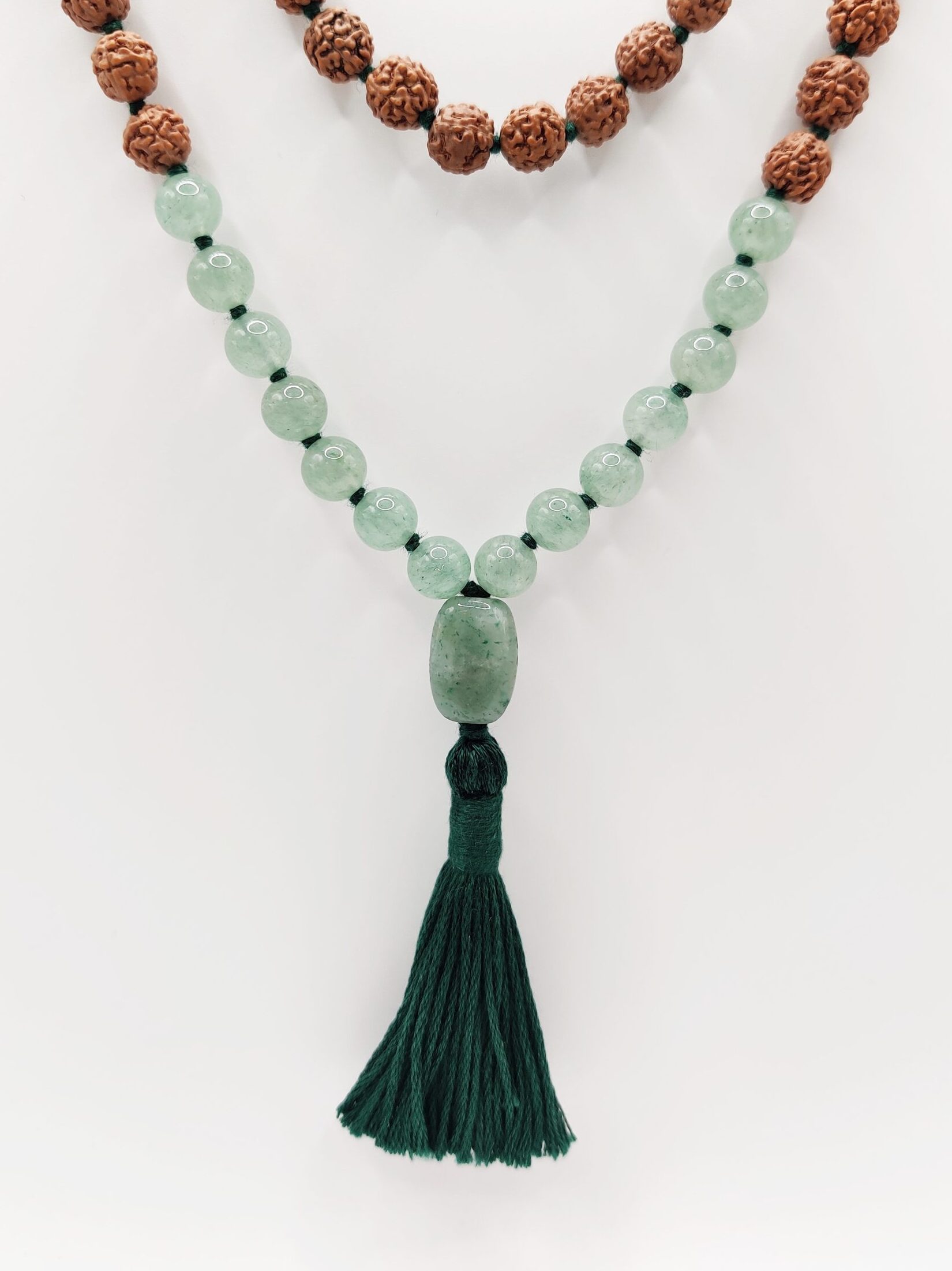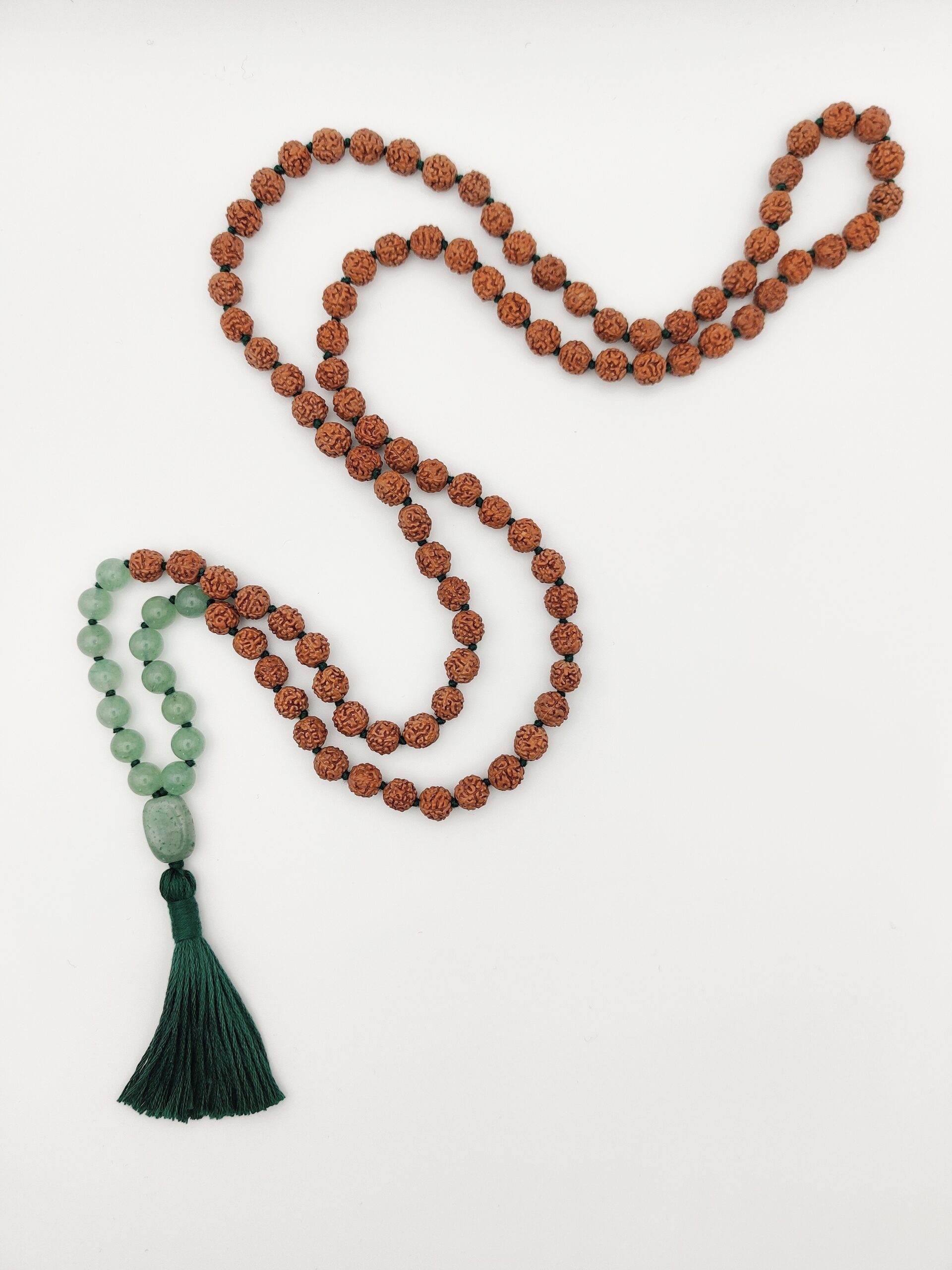 Eine rudrākṣa-mālā mit Aventurin veredelt für die, die es gerne außergewöhnlich mögen.