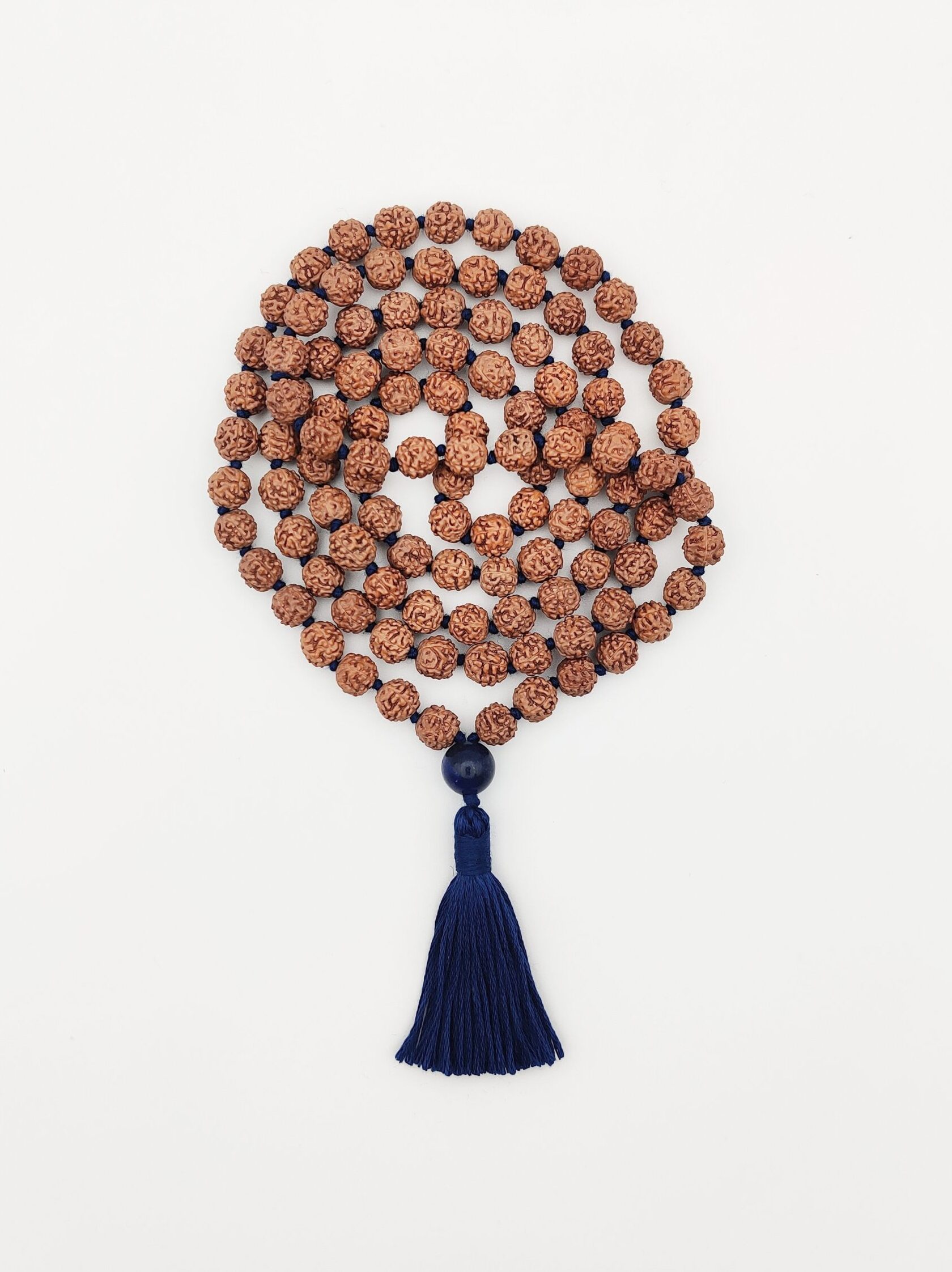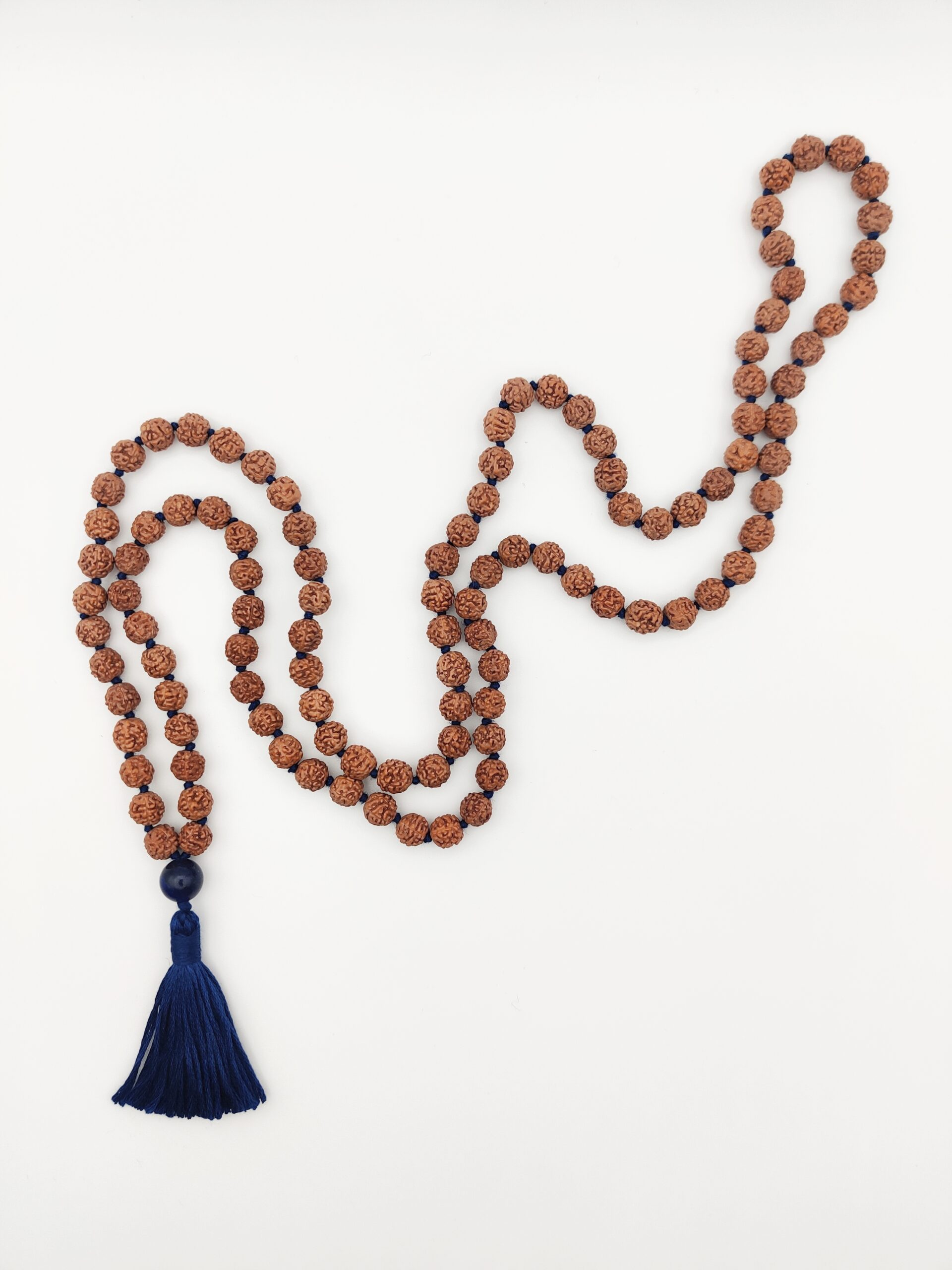 Eine klassische rudrākṣa–mālā mit Guru-Perle aus Lapis Lazuli, dunkelblauem Faden und Quaste. Die aus Indien stammenden Samen sind ungefärbt und unbehandelt.
