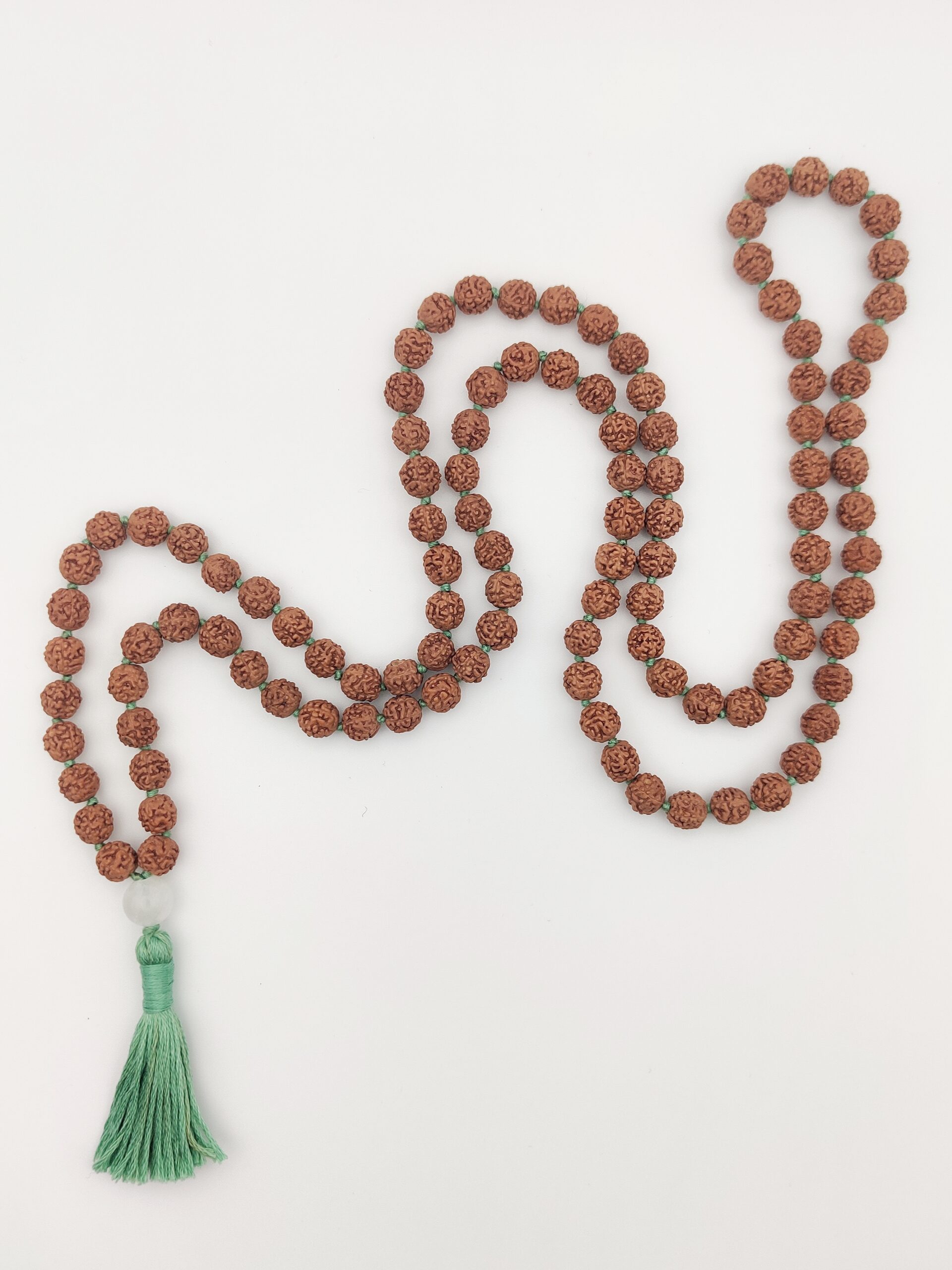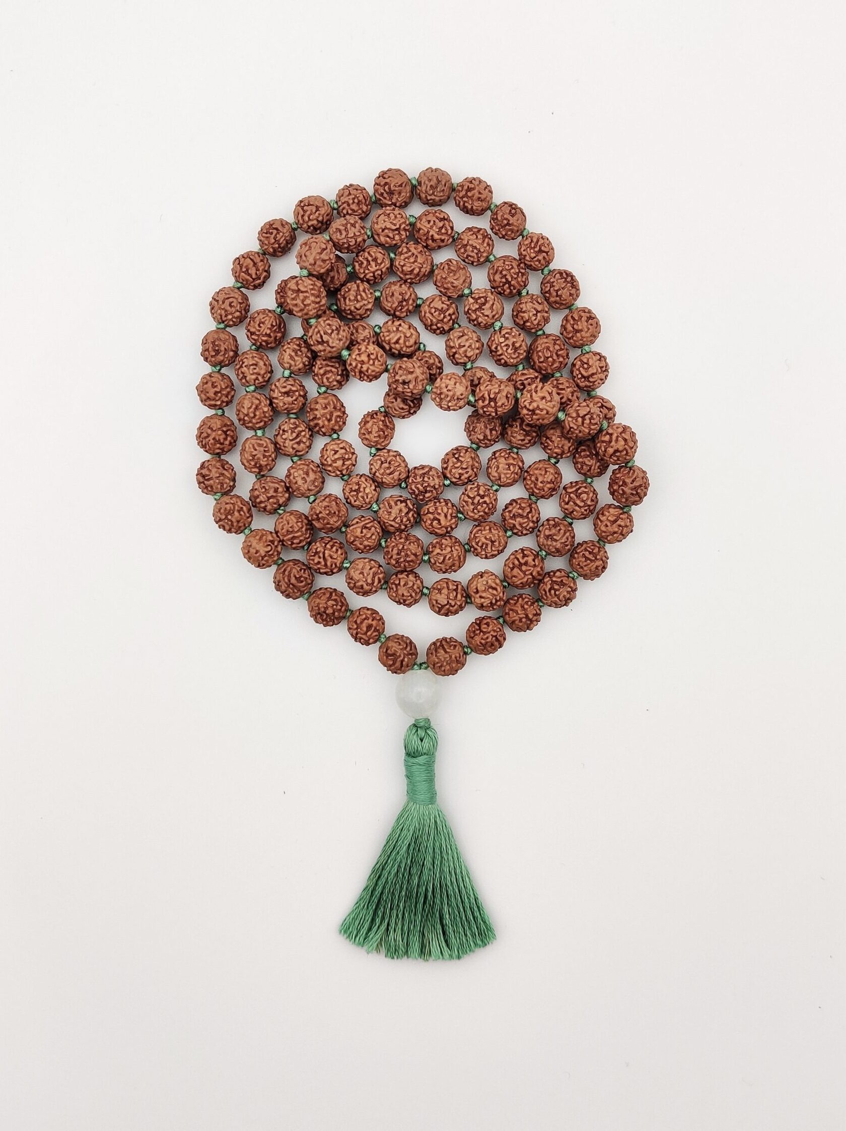 Eine klassische rudrākṣa–mālā mit grünem Faden und Quaste. Die aus Indien stammenden Samen sind ungefärbt und unbehandelt.