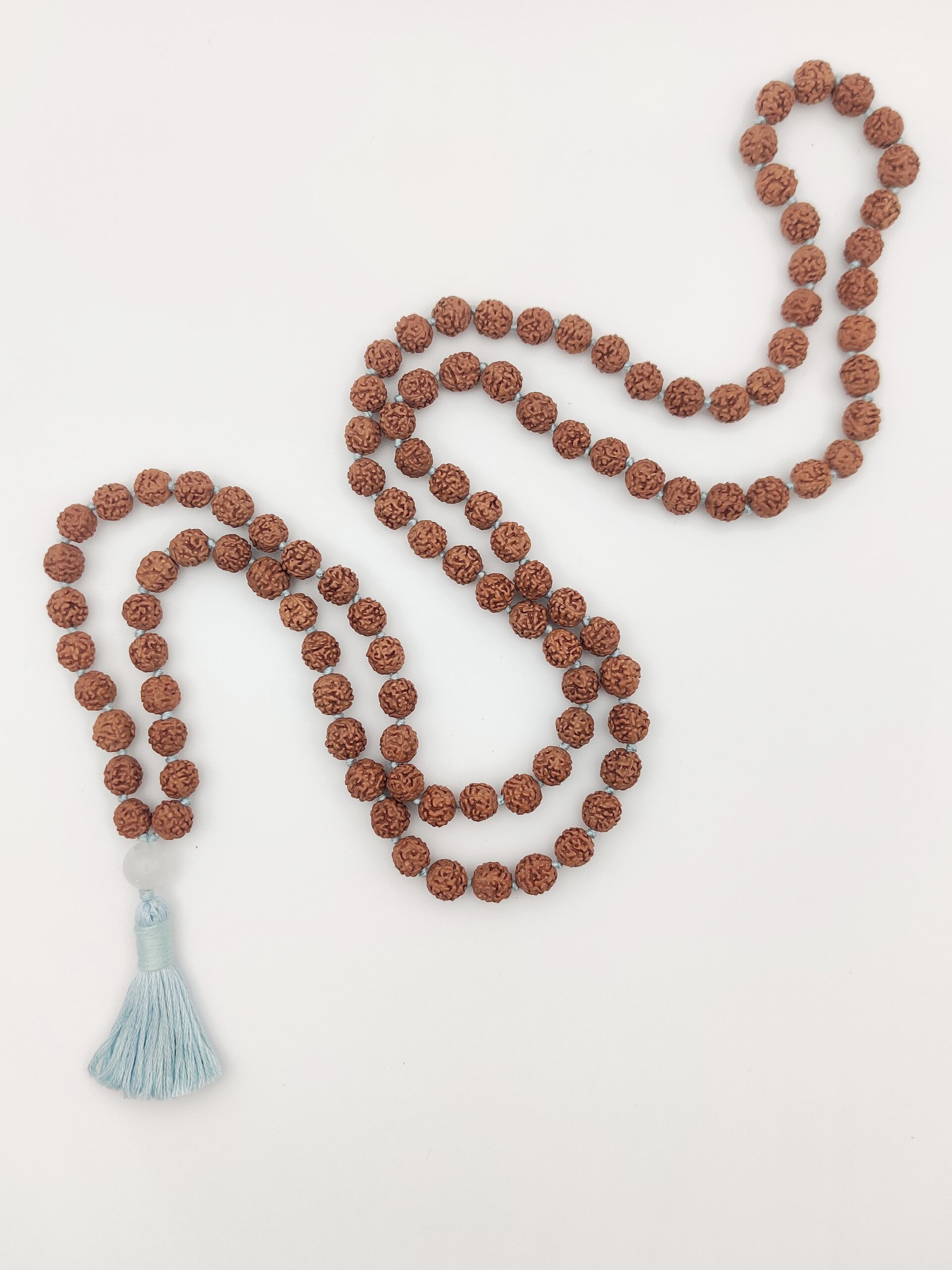 Eine klassische rudrākṣa–mālā mit hellblauem Faden und Quaste. Die aus Indien stammenden Samen sind ungefärbt und unbehandelt.