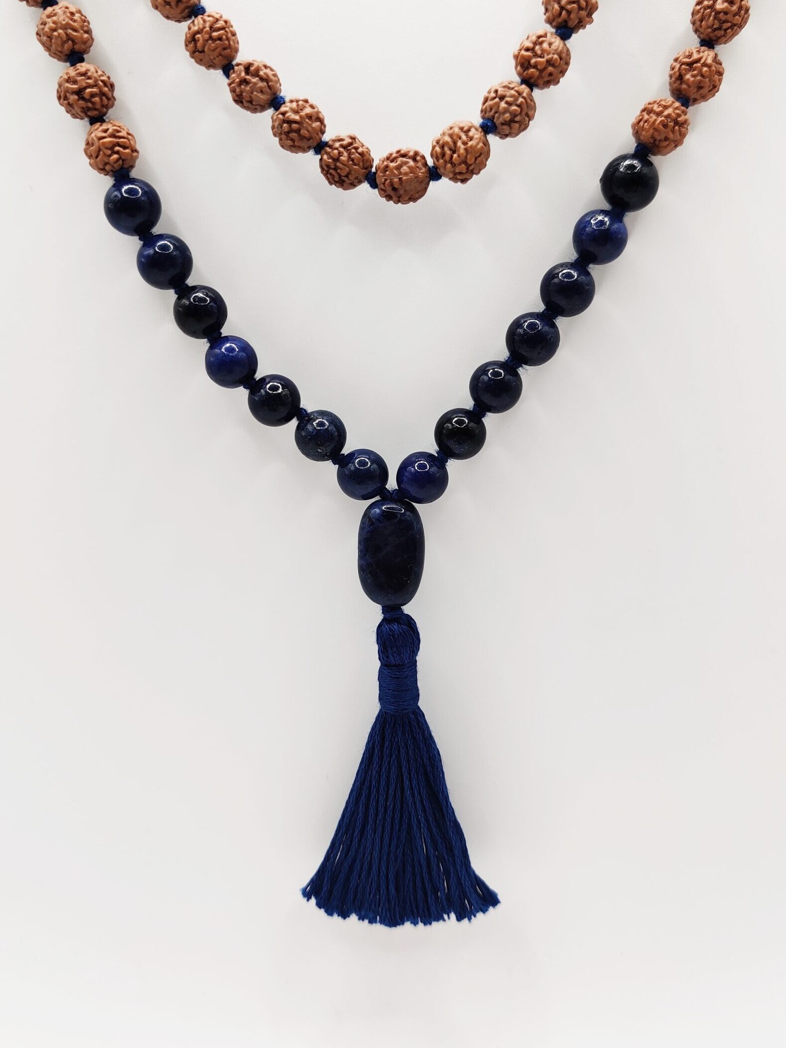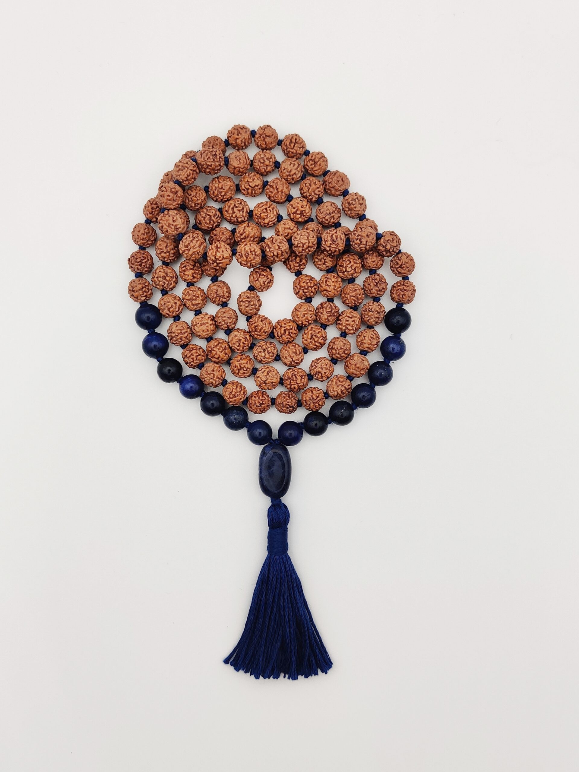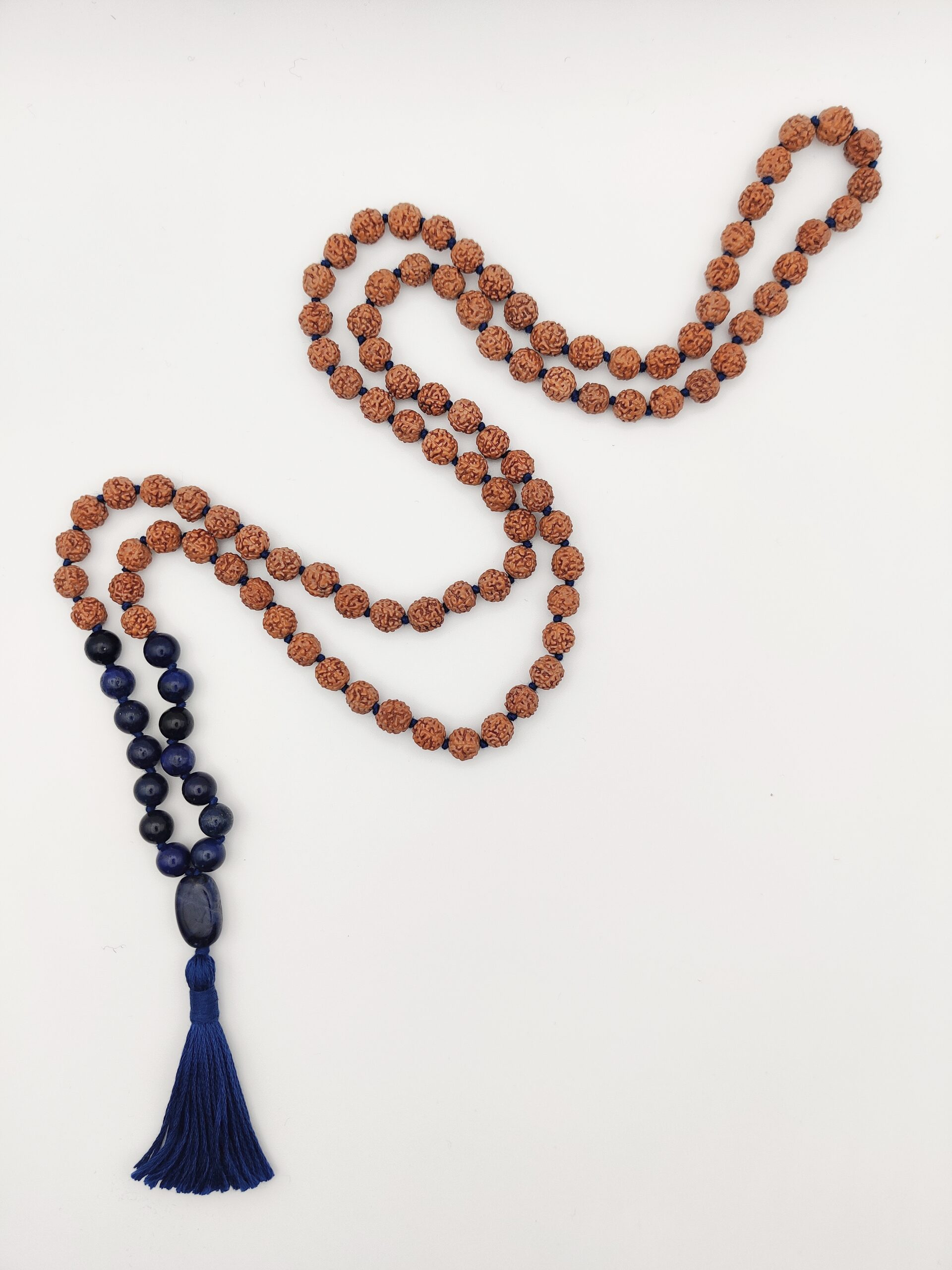 Eine rudrākṣa-mālā mit Lapis lazuli veredelt für die, die es gerne außergewöhnlich mögen.